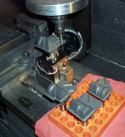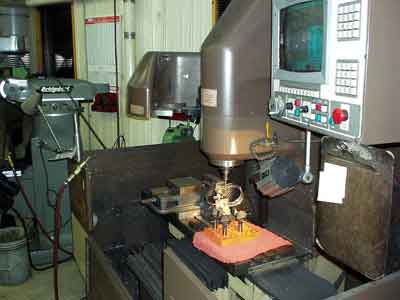 CNC Mill cutting EDM graphics for front pivot mold. Note metal vacuum duct removing dust. |